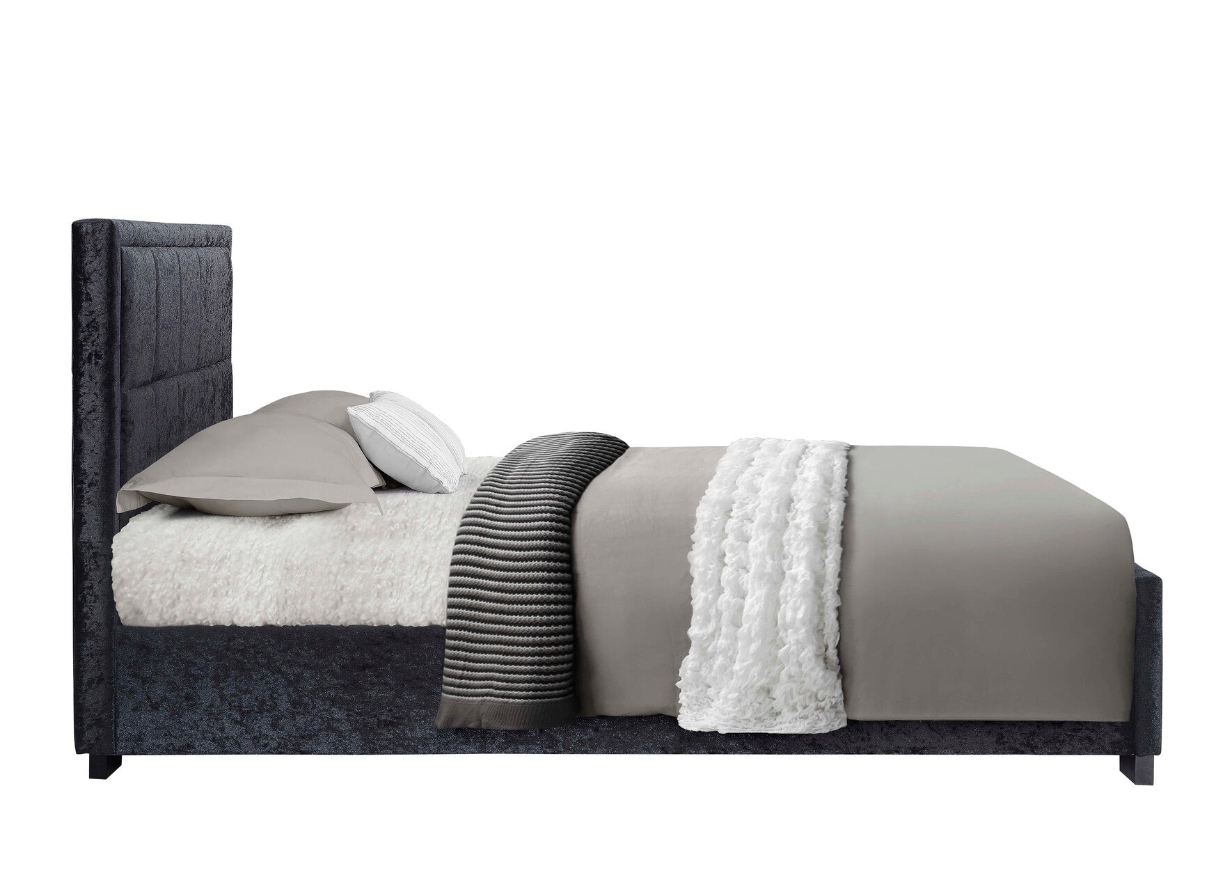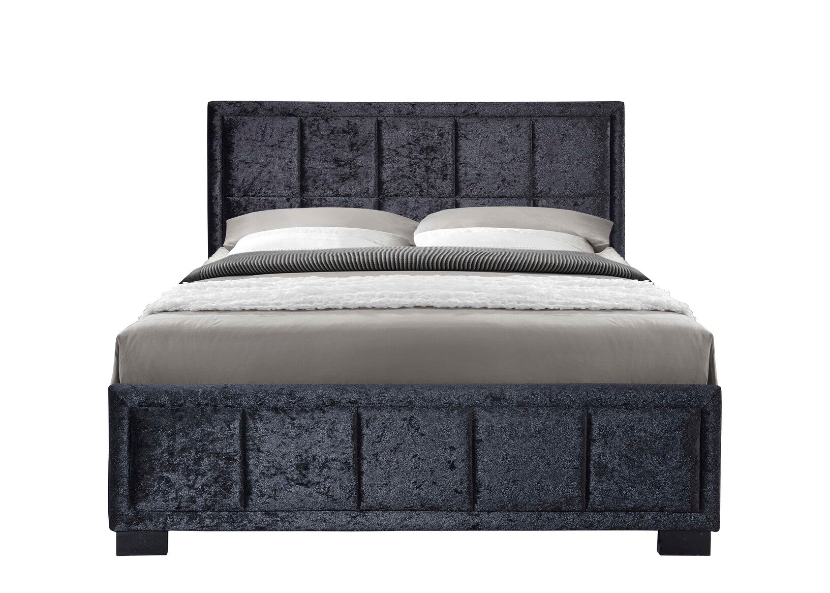 - Available in a steel, black velour or a grey fabric this bed will look stunning in a traditional or contemporary style of bedroom décor.