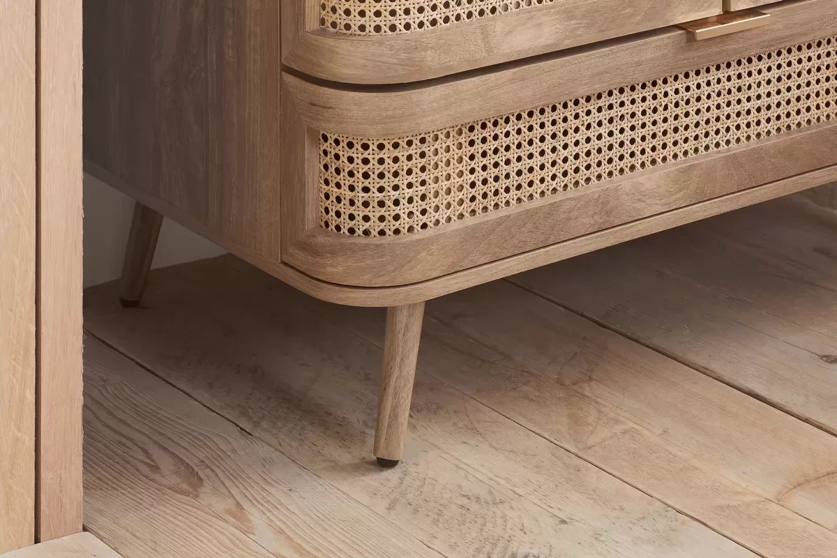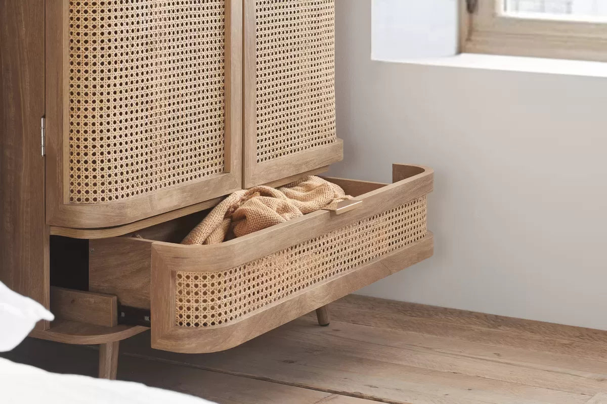 Each curve is thoughtfully softened, featuring delicate bevels that whisper a modern sensibility. The rattan front is meticulously woven, presenting a pattern that is both eye-catching and gracefully reserved.