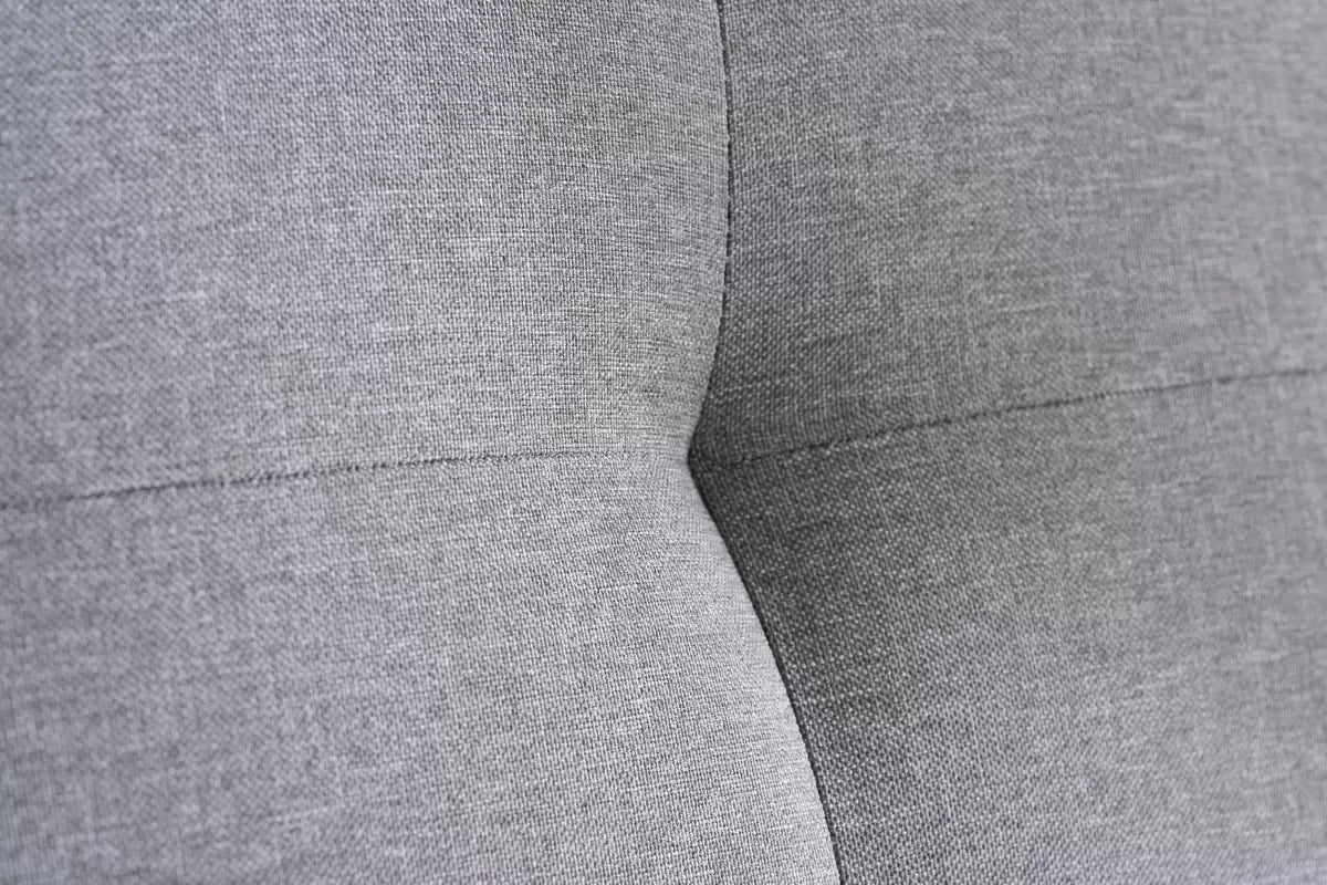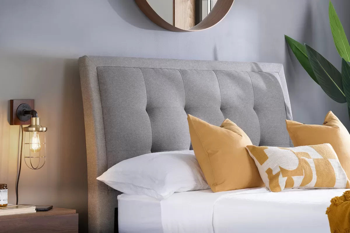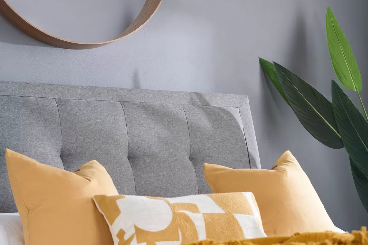 - Upholstered in a beautiful soft grey fabric, this low-based bed features a detailed deep-buttoned headboard