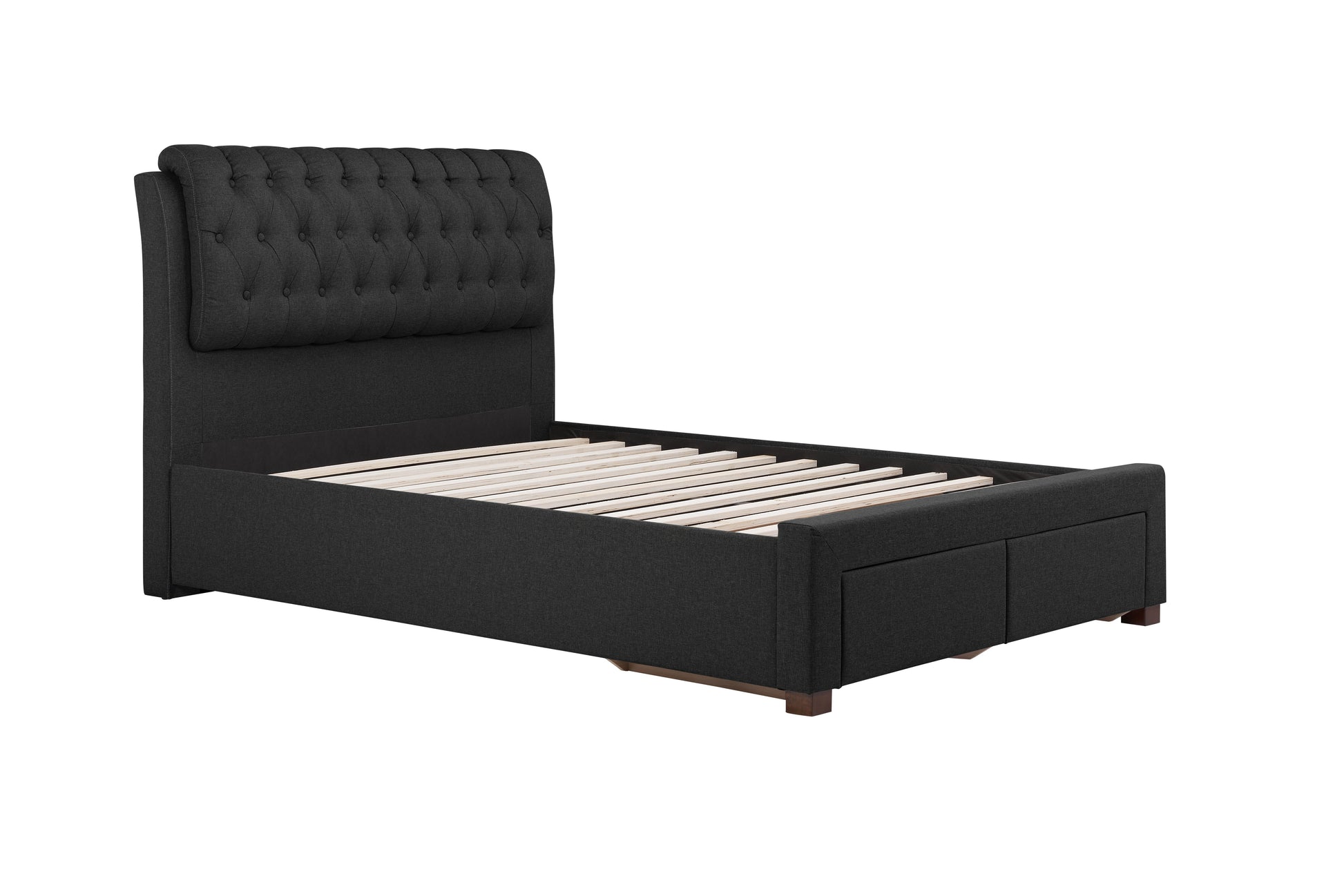 A delightfully upholstered bed that is really brought to life by a detailed buttoned headboard design, the Valentino not only looks great, but offers practicality with two spacious drawers built into the end of the bed. Available in either light dove grey, grey or charcoal polyester, the Valentino frame features a solid slatted base provides firmer support and allows air to circulate beneath the mattress. The maximum weight load for the 4"6 frame is 300 kg, and the 5" frame is 400 kg. Please note: Birlea beds are only suitable for a UK standard size mattress and the recommended maximum mattress height is 305 mm.